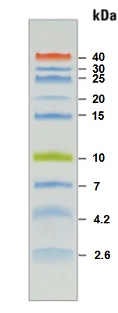 本产品包含9种彩色预染的蛋白marker,分子量范围为2.6-40kD。