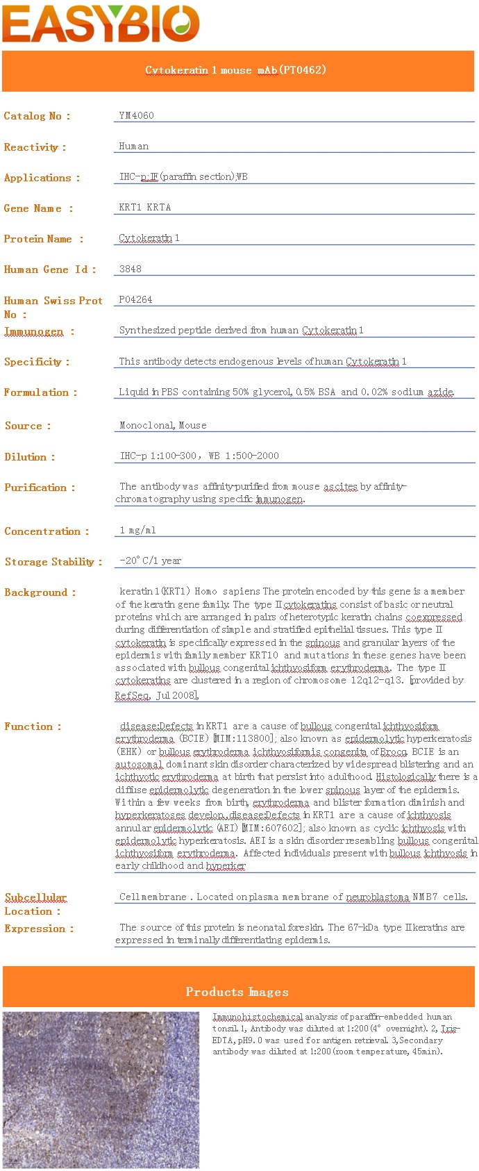 | Product Name: | Cytokeratin 1 mouse mAb(PT0462) |