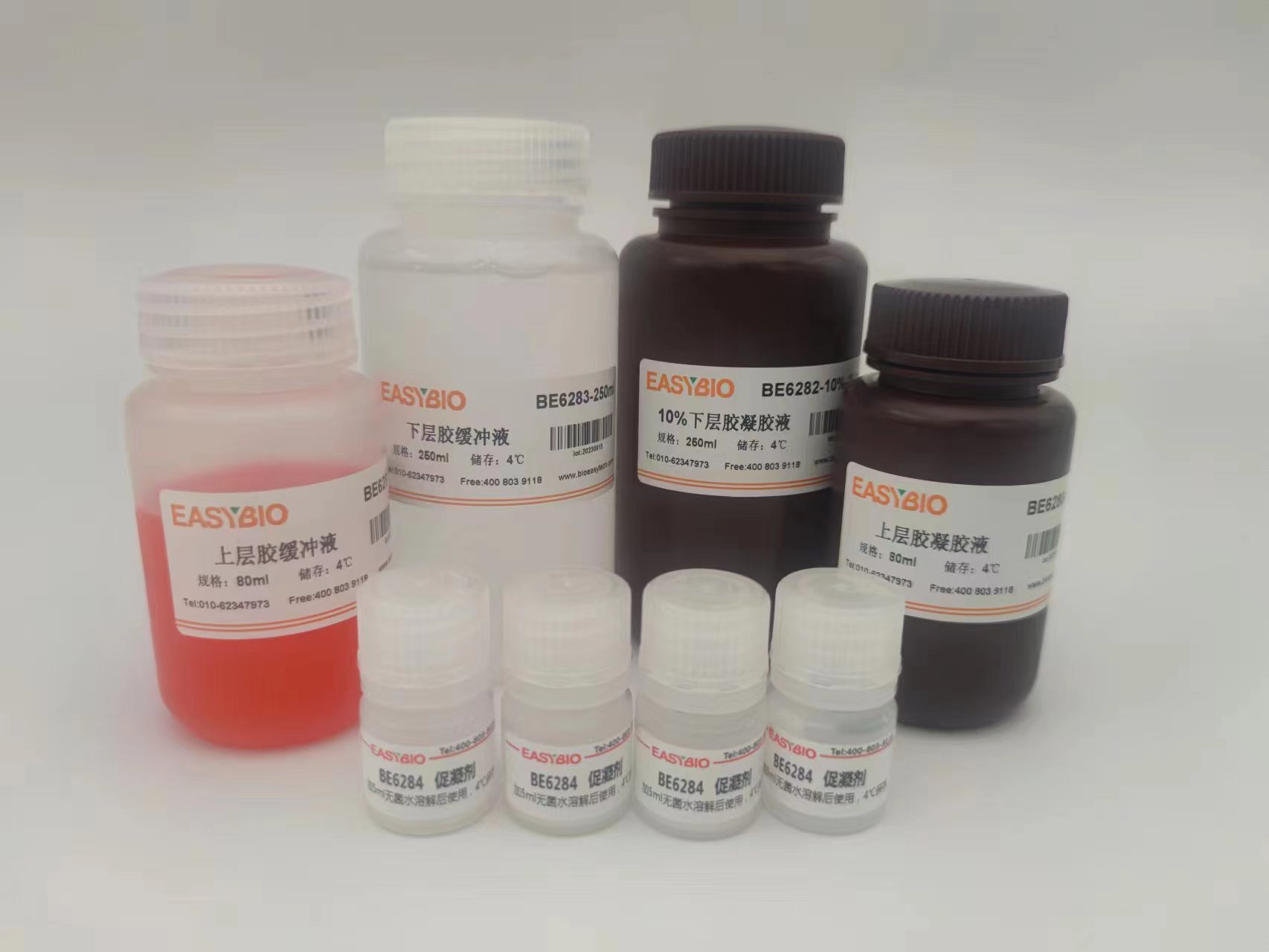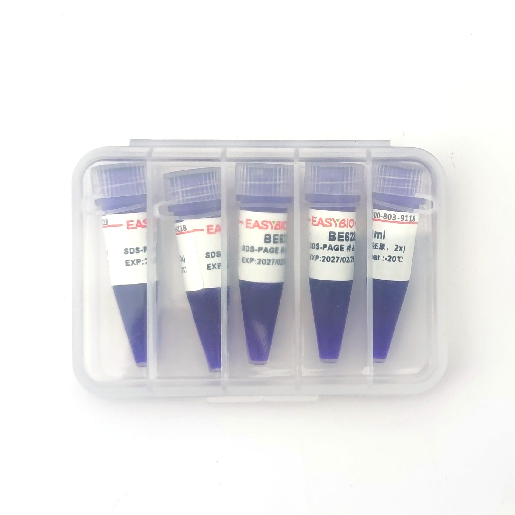 本产品适用于SDS-PAGE(SDS-变性聚丙烯酰胺凝胶电泳)时作蛋白质上样用。其主要成份为SDS,溴酚蓝,缓冲盐溶液等。SDS可与蛋白质结合使蛋白质-SDS复合物上带有大量的负电荷,这时蛋白质本身的电荷完全被SDS掩盖,消除了各种蛋白质本身电荷的差异;SDS还可以断开分子内和分子间的氢键,破坏蛋白质分子的二级和三级结构。最终无电荷差异的蛋白(亚单位),电泳速度除与其分子量大小有关,还和蛋白结构相关。溴酚蓝用作电泳时的指示剂,可大概指示电泳结束的时间。